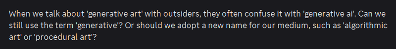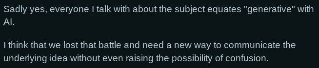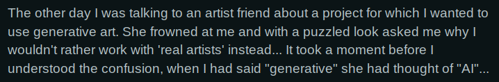 Even the converse, “generative art is not necessarily AI art”, would be met by confusion from most people. ‘Generative’ has been equated to AI.