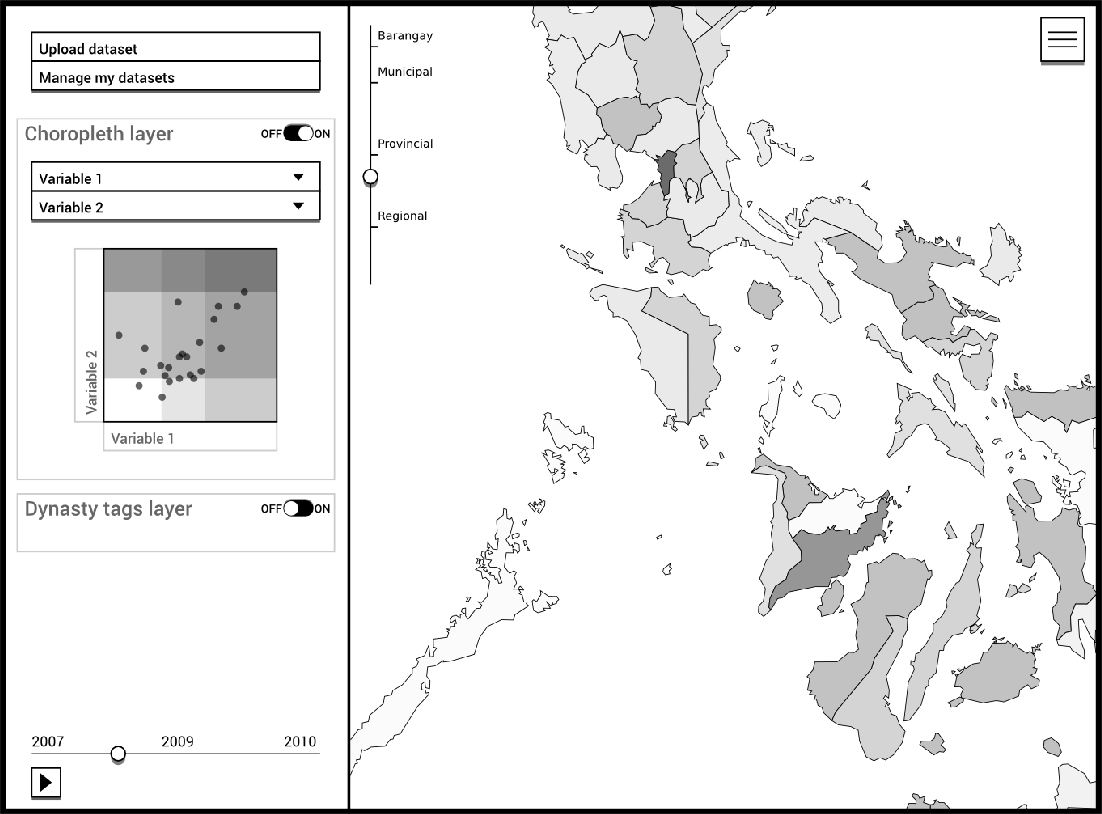 Dynaviz (2015) is a webapp for visualizing political dynasties. It’s a tool for exploring the prevalence and characteristics of dynasties across the country while comparing them against other variables such as population, poverty indices, and education levels.
